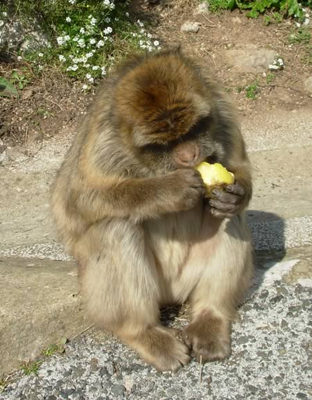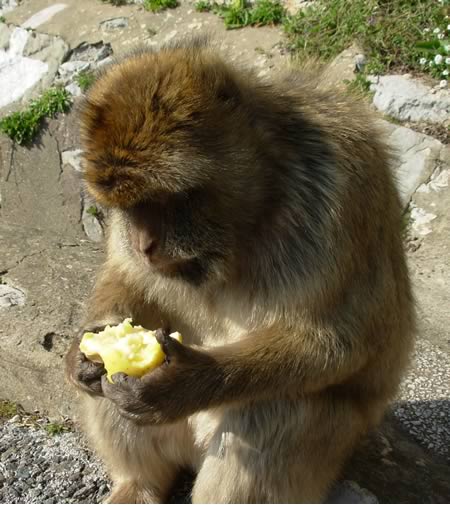Today we went to Gibraltar – I’d heard that the Upper Rock Nature Reserve is the only place to have monkeys in the wild, specifically Barbary Macaques. I wasn’t really expecting to see them, but there were loads of them! At one point, I was walking along, happily eating an apple when one of the monkeys came up to me, climbed up my leg and grabbed my apple. Unfortunately this all happened too quickly to get on camera, but I did manage to take the following pics of the monkey eating the stolen apple: